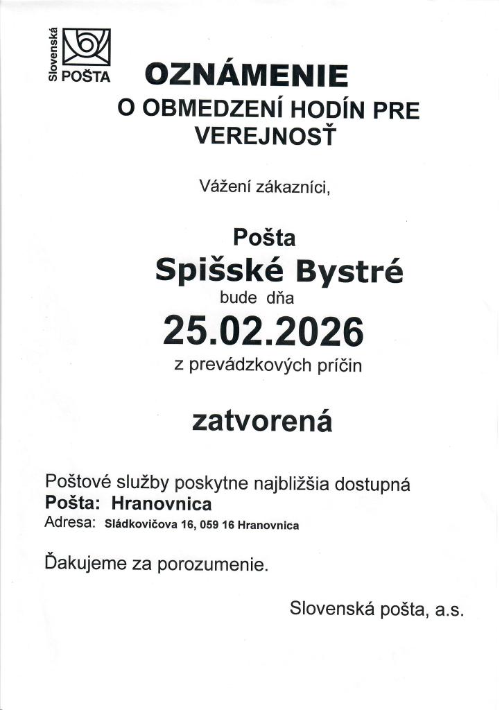 Vážení občania, dňa 25.02.2026 bude pošta Spišské Bystré zatvorená z dôvodu prevádzkových príčin. V tomto čase budú poštové služby zabezpečené na pobočke v Hranovnici, ktorá sa nachádza na adrese Sládkovičova 16, 059 16 Hranovnica. Ďakujeme za porozumenie.